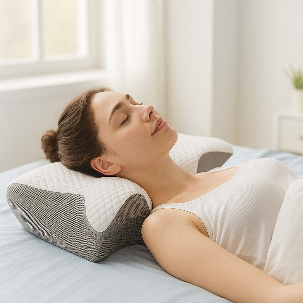 Simply rest your head on the uniquely contoured pillow during sleep or rest. The butterfly shape cradles your head and supports natural spinal alignment. The memory foam relieves tension and keeps your posture ideal through the night — so you wake up without stiffness or pain.